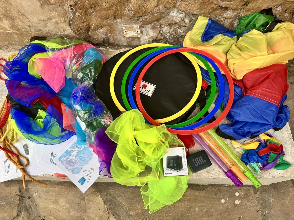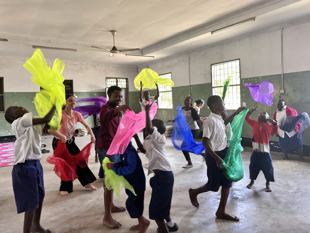 With the support of donations we could bring in different materials, like colorful scarves, a parachute, and rings. Moving with these objects helps expand the students’ movement repertoire, caters to individual abilities, and boosts confidence by shifting focus from just movement to engaging with the materials.