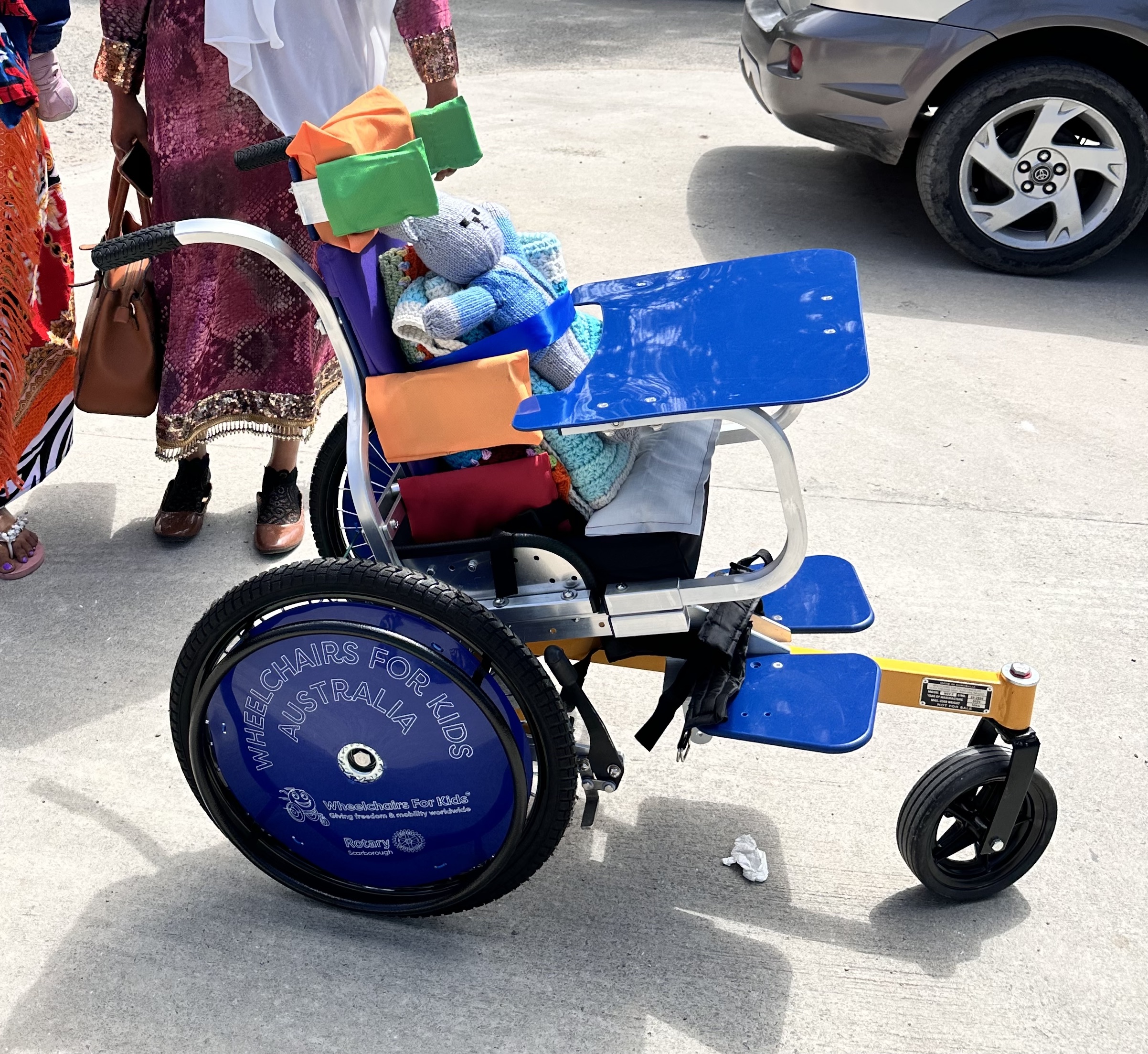 We also provided strollers for three boys aged 2 and 3 with cerebral palsy. Abdul, who can’t sit or walk independently, requires regular hospital visits. His mother, the sole caregiver, must transport him; since she just had another baby, she cannot carry both children. The foldable off-road stroller was perfect for him.